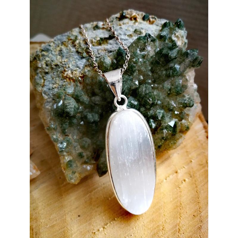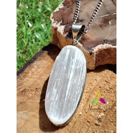Pendentif pierre de sélénite blanche cerclée plaqué argent 4cm (prix pendentif seul)