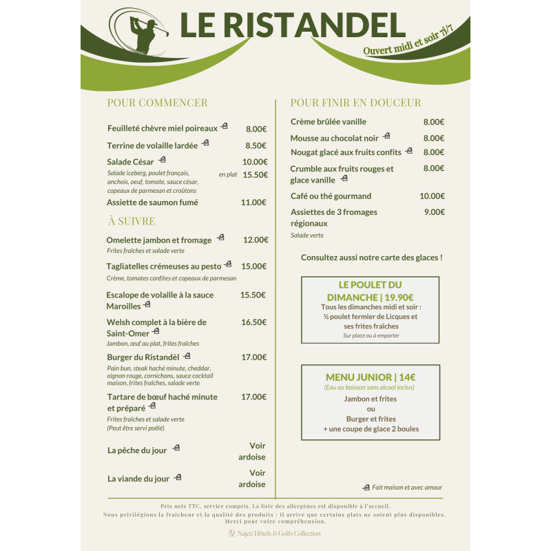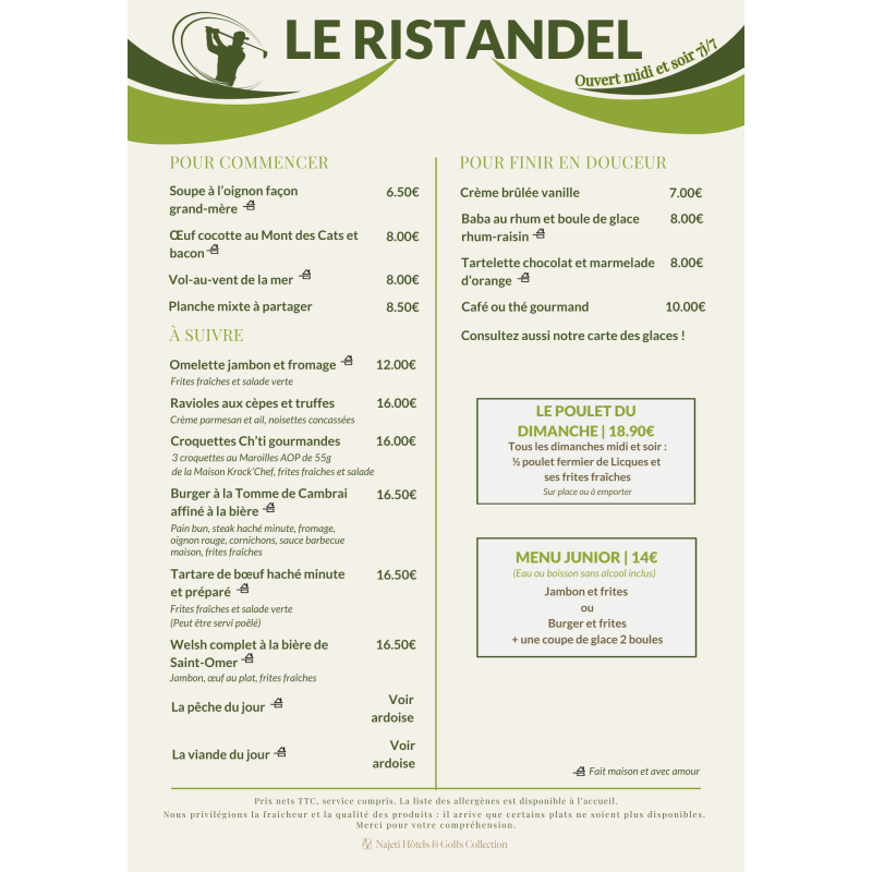 Avec une vue imprenable sur l’Aa Saint-Omer Golf Club grâce à ses grandes baies vitrées et sa terrasse moderne, bienvenue au restaurant Le Ristandèl.