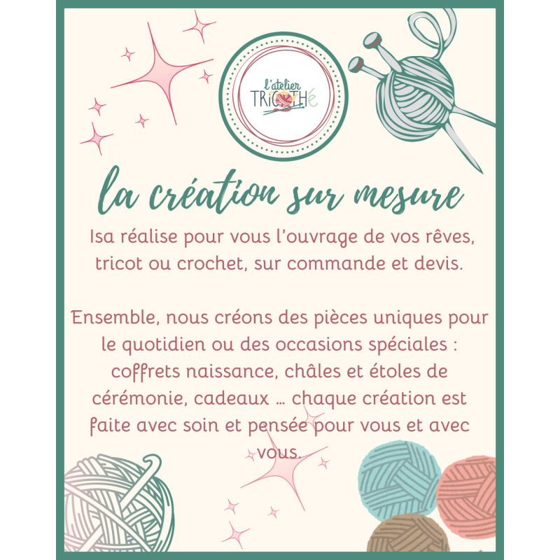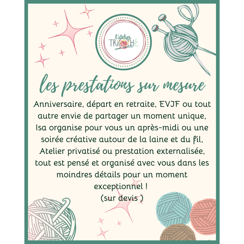 Vous souhaitez progresser et être accompagnée ponctuellement sur un projet précis en tricot ou crochet ? Vous avez envie de partager des moments joyeux et tisser des liens autant que des fils ? Vous voulez poursuivre l'expérience entamée en atelier ?