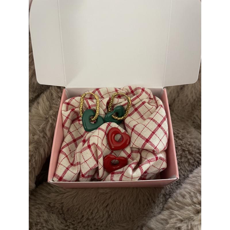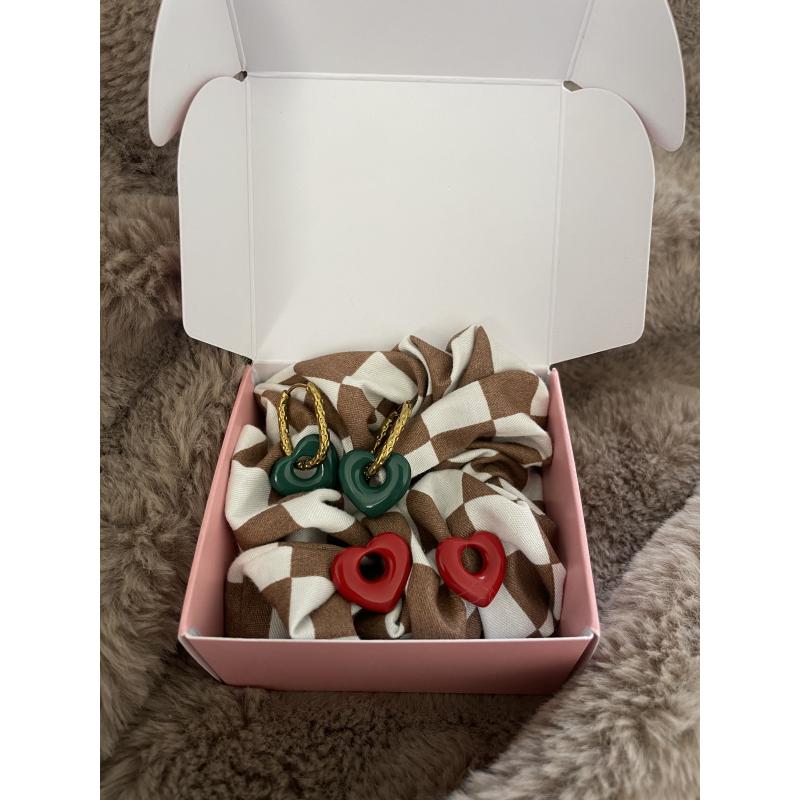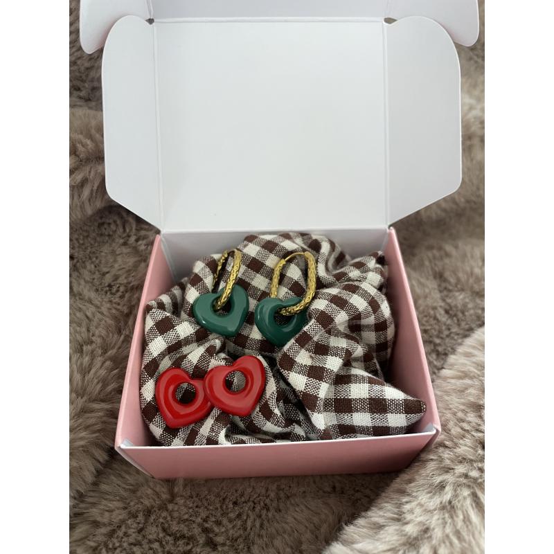 Coffret exclusif contenant un chouchou cousu-main au choix, une paire de boucles d’oreilles en acier inoxydable et des charms colorés