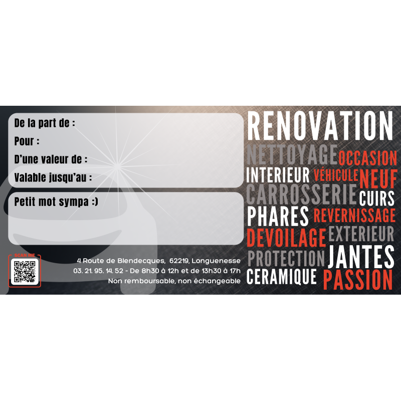La carte cadeau RENOV SERVICES permet d’accéder à un large choix de prestations pour redonner éclat et valeur à tous les véhicules :
