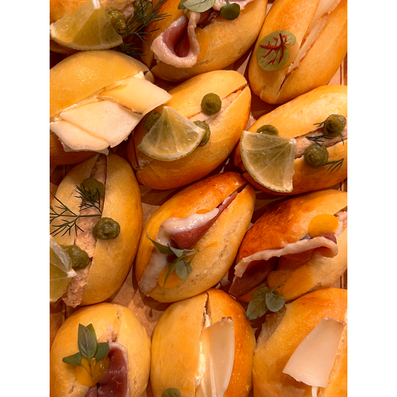 Les navettes garnies - Le plateau de 12 (magret de canard fumé maison, rillette de saumon maison, tome de brebis fumée maison)