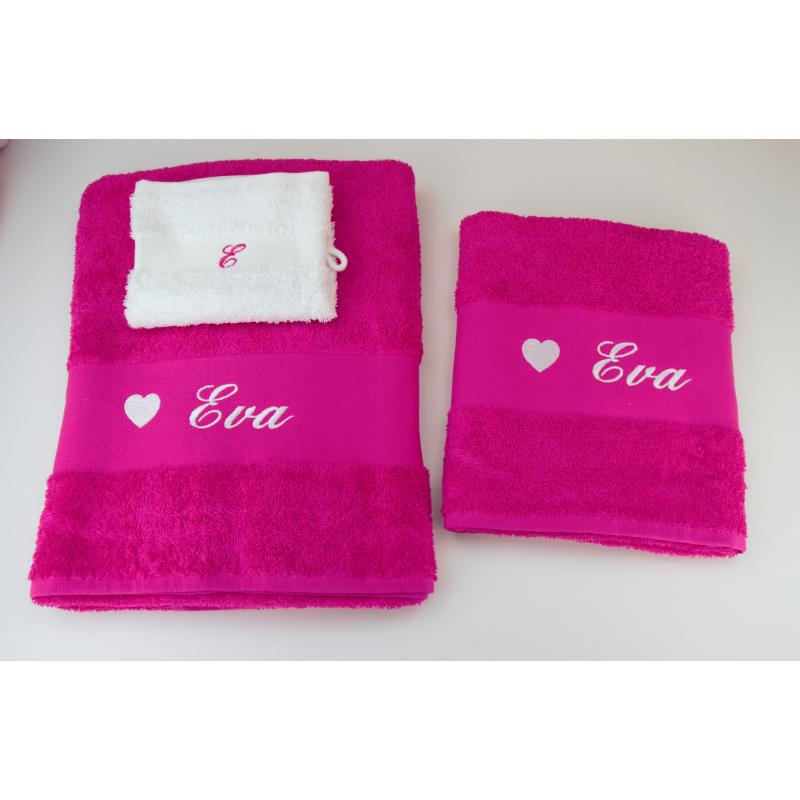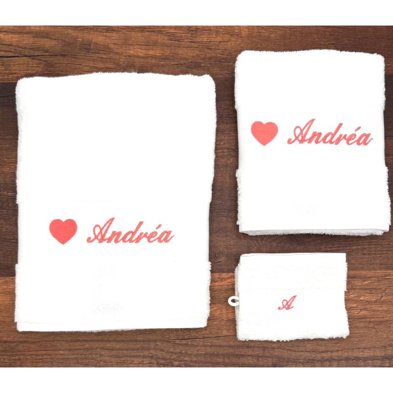 En option, vous pourrez ajouter le drap de bain assorti et un gant de toilette BLANC brodé avec l'initiale du prénom
