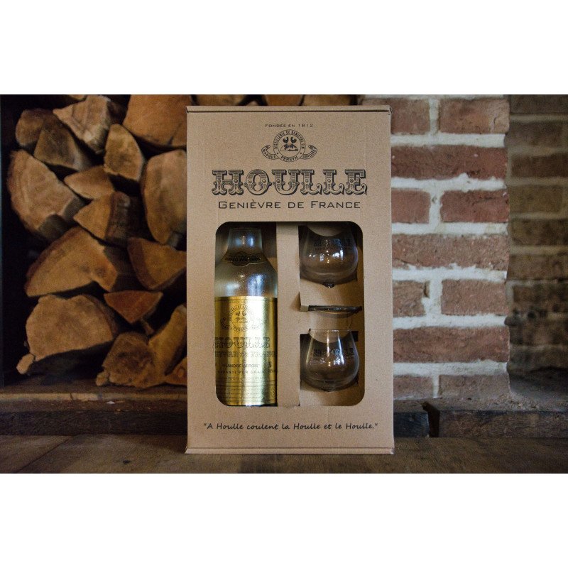 Coffret de dégustation comprenant 1 bouteille de Genièvre de Houlle Or* 70cl, 40% vol. et 2 verres de dégustation - Distillerie Persyn fondée en 1812.